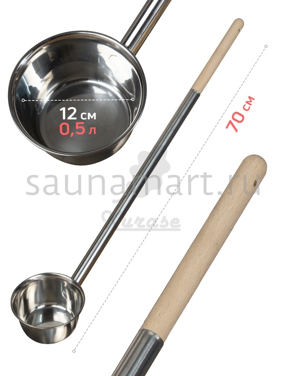 Объем 500 мл. Длина банного инвентаря 70 см, диаметр ковшика 12 см. Ручка выполнена и дерева бук, низкой теплопроводности. Длинная ручка позволит не приближаться к раскаленной печи. Для максимальной защиты рук от термического воздействия применяйте специальные войлочные рукавицы для бани. Металлическая часть ковша выполнена и полированной нержавеющей стали, что придает ковшу эстетичный внешний вид и предотвращает образование ржавчины, что значительно увеличивает срок службы изделия.