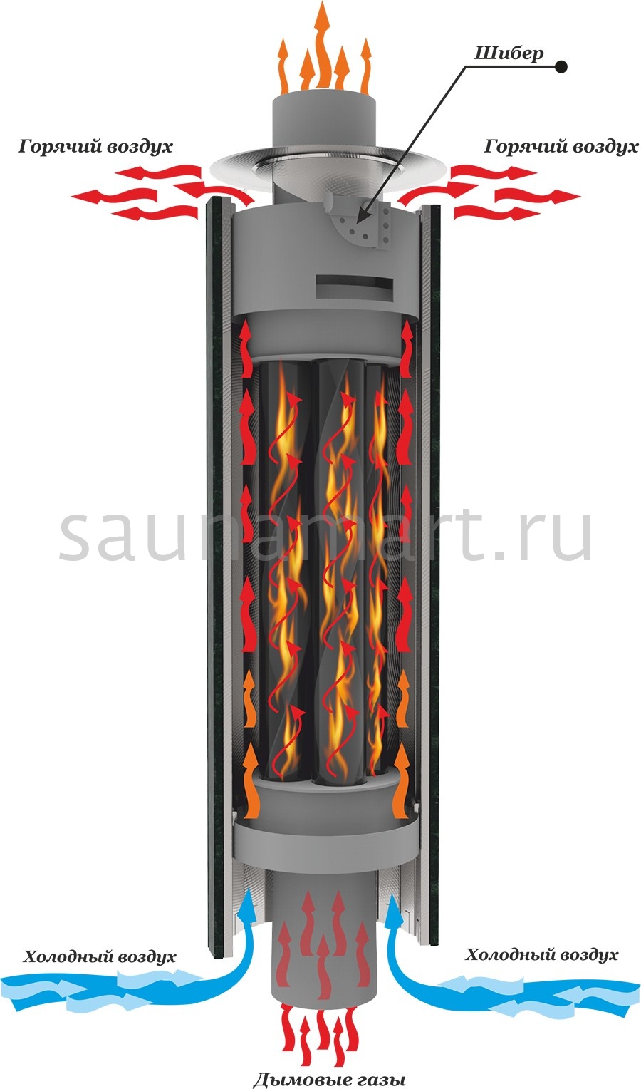 Дымоход-экономайзер – это энергосберегающий модуль дымоходной системы, оснащенный наружными теплообменными ребрами или спиралями для дополнительного отбора тепла. Изготавливается из конструкционной стали (толщиной 1.5-2 мм) или нержавейки AISI 430, имеет цилиндрическую форму с развитой внешней поверхностью. При прохождении дымовых газов (температурой до 450°C) ребра нагреваются, передавая тепло в помещение через конвекционные потоки. Монтируется на вертикальных участках дымохода, повышая КПД системы на 15-25% без изменения конструкции печи. Особенность: требует регулярной очистки от сажи из-за сложной геометрии поверхности.