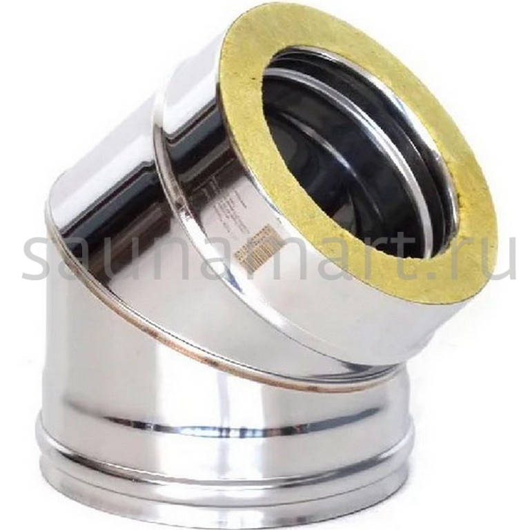 Отвод Термо 45° ОТ-Р 430-0.8/430 D115/200* (2S) — угловой элемент для двухконтурных дымоходных систем с термоизоляцией. Внутренний контур изготовлен из нержавеющей стали AISI 430 толщиной 0.8 мм (?115 мм), внешний - AISI 430 (?200 мм). Двойное раструбное соединение (2S) обеспечивает повышенную надежность.