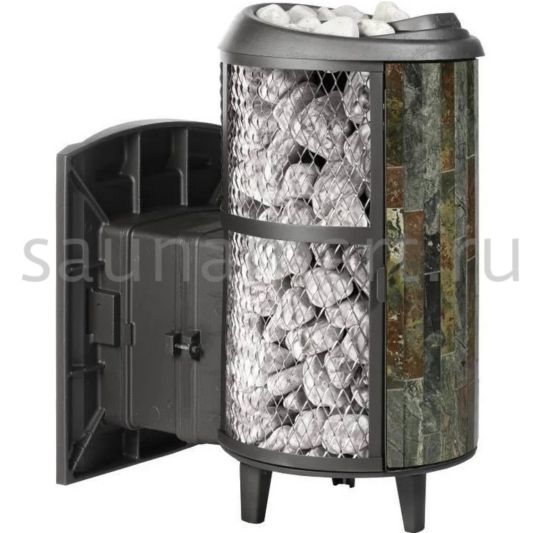 Модель с комбинированной облицовкой из нержавеющей сетки и ламелей. Особенность модели - открывающаяся дверь с ламелями. Это оригинальное решение обеспечивает быстрый прогрев парной.