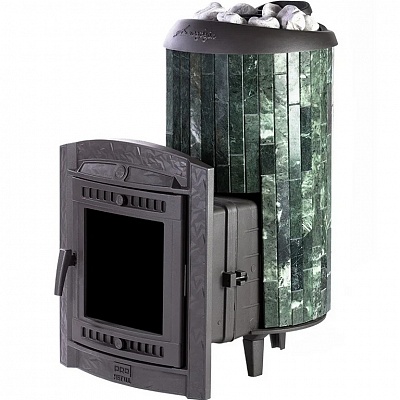 Модель с увеличенной каменкой и повышенной производительностью. Ламели из змеевика, расположенные по периметру внешней каменки, не только обладают отличными теплонакопительными свойствами, но и придают печи уникальный внешний вид.