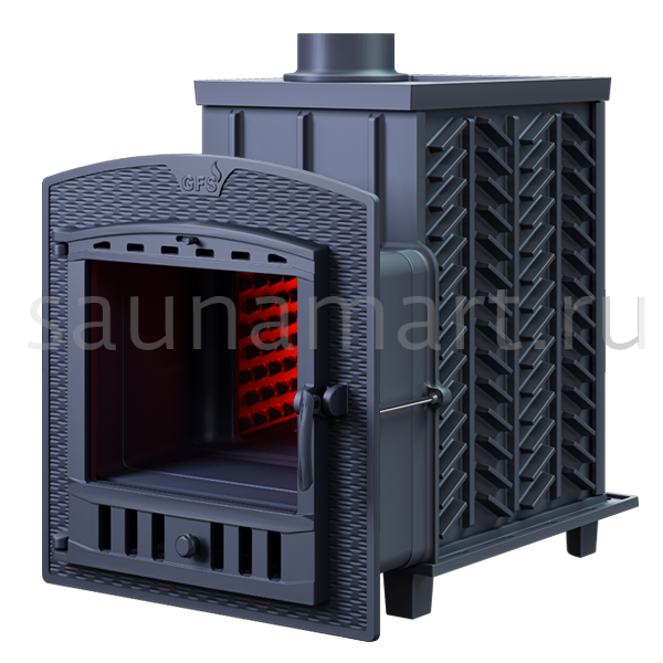 GFS-ЗК 25 (П)2 — это печь с усиленной каменкой большей массы, с единым углублением внутрь топки для дополнительной укладки чугунного заряда. Теплосъемные шипы, со стороны горения пламени, в разы увеличивают площадь соприкосновения огня с каменкой и ускоряют передачу тепла, а также способствуют лучшему дожигу, смешивая потоки пламени и воздуха, поступающего из воздушника. Эти усовершенствования значительно повышают мощность парообразования печи и выдают большее количество пара при непрерывной подаче воды. Каменка печей GFS-ЗК является незаливаемой.