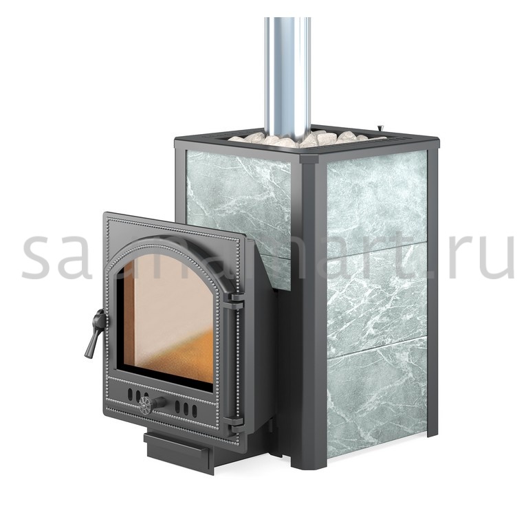 Банная печь ЛЕГЕНДА 22 (505) укомплектована чугунной каминной, самоохлаждаемой дверцей Везувий 505 с большим жаропрочным стеклом «SCHOTT ROBAX», с оборудованной системой самоочистки, что позволяет визуально контролировать горение и любоваться видом живого огня.