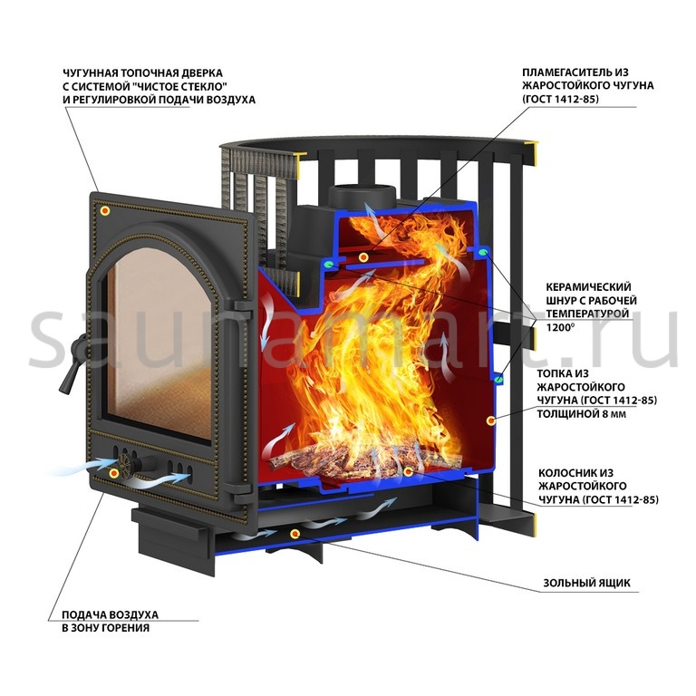 - Материал топки: жаростойкий чугун (ГОСТ 1412-85)
