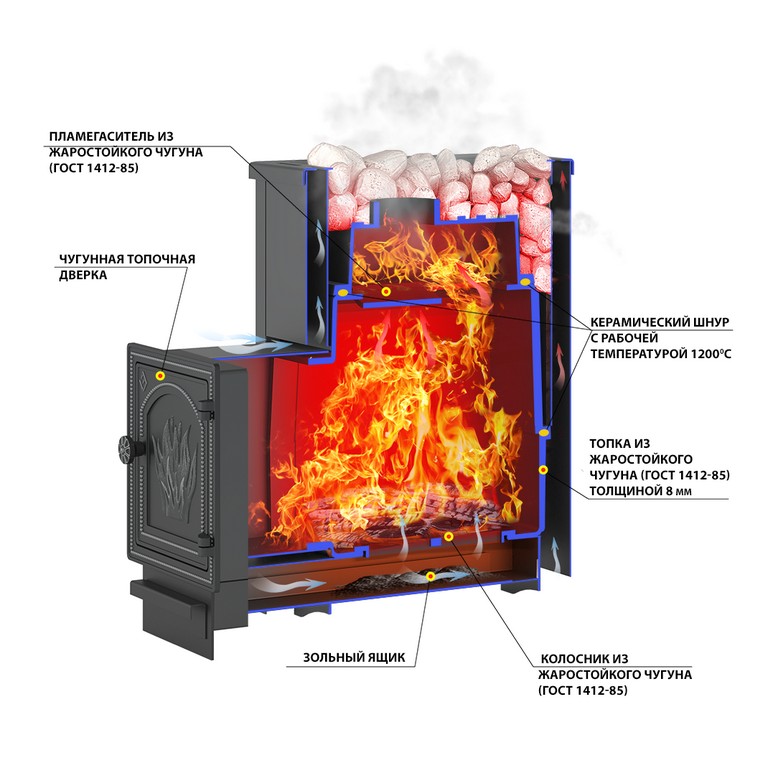 Конвекционный кожух обеспечивает активное движение воздуха и прогрев расчётного объёма парилки за минимальное время. Закладом камней в кожух организуют открытую каменку для получения плотного пара.
