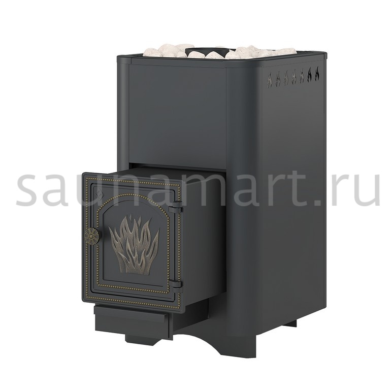Открытая каменка устраивается путём закладывания верхней части топки банными камнями. Для камней средней и крупной фракции предназначен внутренний короб с вертикальными отверстиями. Дверка, пламегаситель и колосник изготовлены из чугуна, что увеличивает их прочность и срок службы. Интенсивность подачи воздуха в зону горения регулируется зольным ящиком совкового типа.