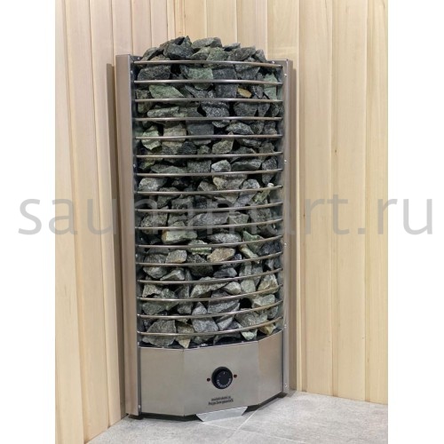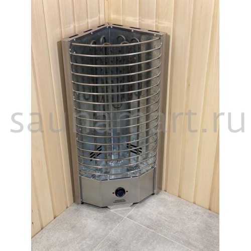 Особенности конструкции: специальная треугольная форма для угловой установки, выносной механический пульт управления, ТЭНы из нержавеющей стали AISI 321, угловое размещение с минимальными отступами 30 см от стен, каменка закрытого типа с фронтальной загрузкой, ручная система парообразования (полив через верхнюю дверцу). Дополнительно: термозащитный экран, индикатор нагрева.