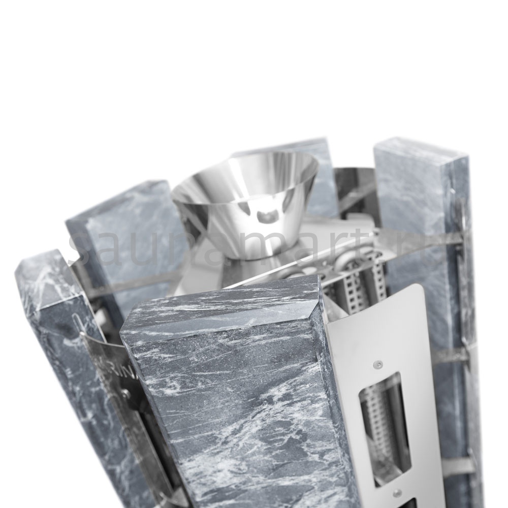 - Закрытая каменка: Выше парогенератора имеется емкость под мелкие камни или нержавеющие шары объемом 4.7 л, вмещающая 10 кг мелкого камня, называемая закрытой каменкой с воронкой для подачи воды и получения мелкодисперсного пара.