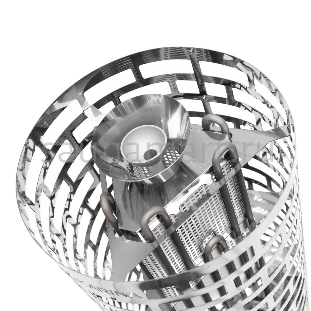 Электрокаменка Karina Nova 12E предназначена для использования в парных объемом до 16м3. Печь выполнена в напольном варианте цилиндрической формы. Напряжение питания– 380В. Данная модель укомплектована 3 ТЭНами, расположенными в виде треугольника. Внизу каменки располагается бак для воды емкостью 3 л, который является парогенератором. Выше парогенератора находится емкость под мелкие камни или нержавеющие шары объемом 2.5 л, вмещающая 5 кг мелкого камня, называемая закрытой каменкой с воронкой для подачи воды и получения мелкодисперсного пара. Электрическая печь Karina Nova 12E многофункциональна, и при правильной эксплуатации она подойдет для любителей как финской сауны, так и русской бани.