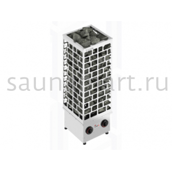 Корпус печи имеет нетипичную форму вертикального параллелипипеда с квадратным поперечным сечением. Нагревательные элементы находятся в центре электрокаменки и по краям обкладываются камнем. Готовая к эксплуатации печь напоминает каменную башню и позволяет поддавать воду во время парения не только сверху каменки, но и по всей поверхности корпуса.