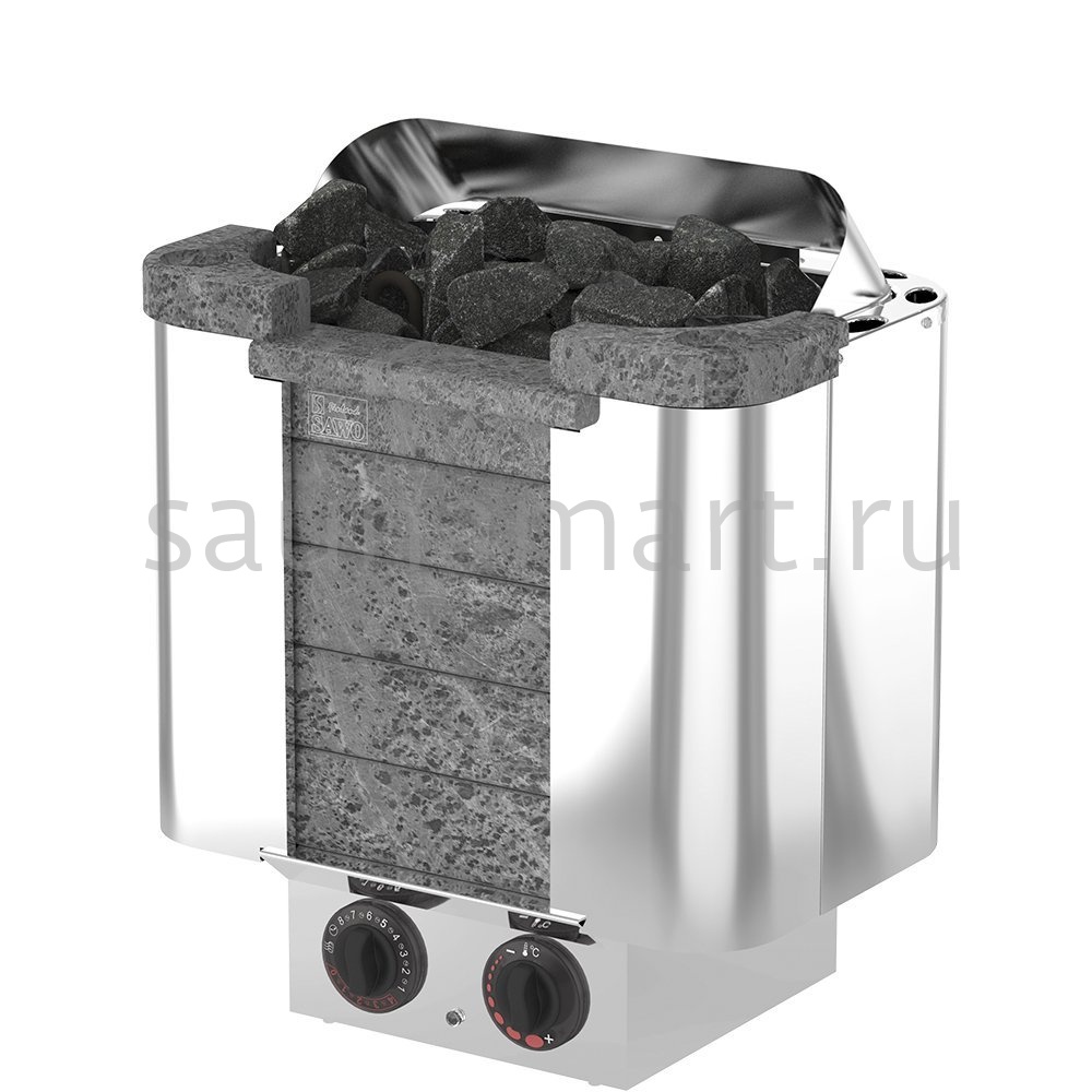SAWO Электрическая печь CUMULUS CML-80NB-P Электрокаменка Sawo Cumulus вместимостью до 25 кг камней. Дополнительные кубы мыльного камня могут быть добавлены в каменку по желанию. Каменка со вставками из талькохлорита спереди и оригинальной подсветкой. Встроенный блок управления.