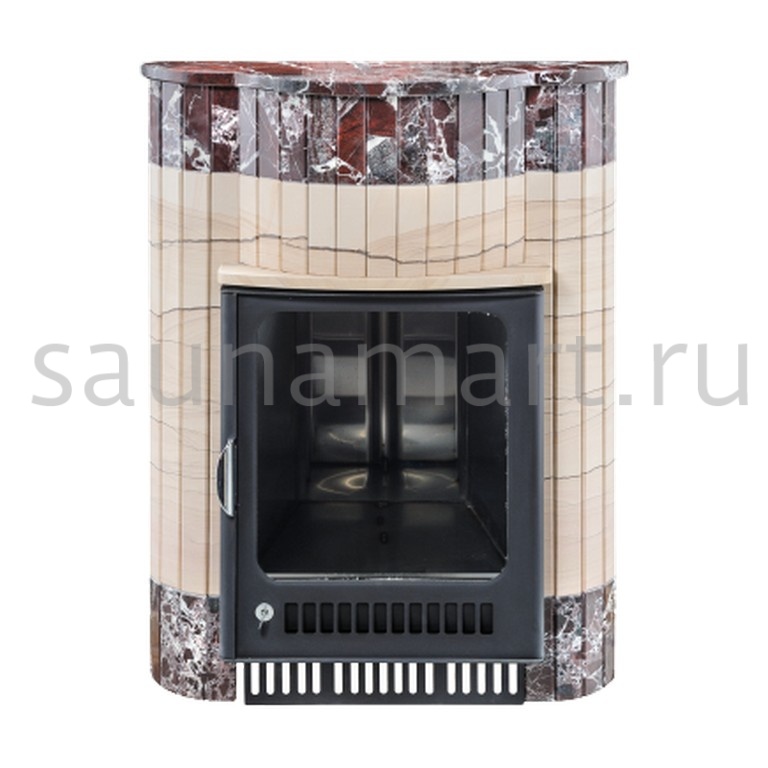 Для печи «Оптима» серии ПФ производитель V?hringer выпускает порталы из натурального мрамора, змеевика и жадеита. Облицовочные материалы поступают на завод в слэбах, заготовки разрезают на пластины, которые затем навешивают на печь.