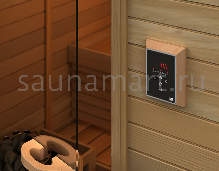 Сенсорные клавиши пульта подсвечены контрастным красным в тон информационному табло. Подсветка не только ярко, но и весьма эффектно смотрится на фоне чёрного корпуса и экрана. К данной модели подключается не только управление электрокаменкой, но и освещение с вентиляцией в сауне, что вдвойне удобно. Пульт позволяет настроить режим парения на ближайшие 0-12 часов и отложить старт на 1-24 часов, а также автоматизировать включение и выключение сауны. Последняя функция будет весьма прагматична при эксплуатации в коммерческой бане. Функция блокировки клавиатуры станет незаменима для семейных саун с детьми. Подключение пульта производится к сети с напряжением 220В или 380В.