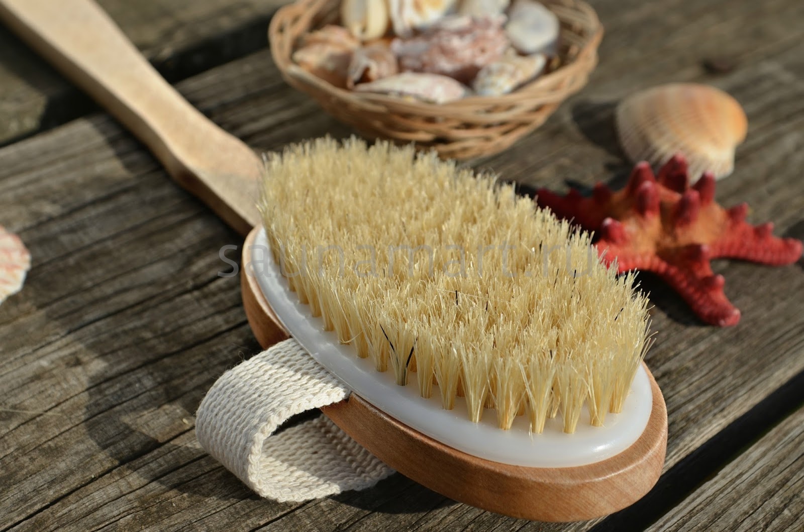 Щетка для сухого массажа и душа с удобной ручкой обеспечивает интенсивное обновление кожи и стимулирует микроциркуляцию.