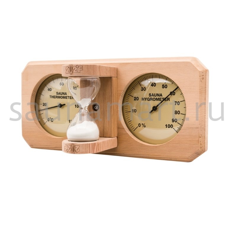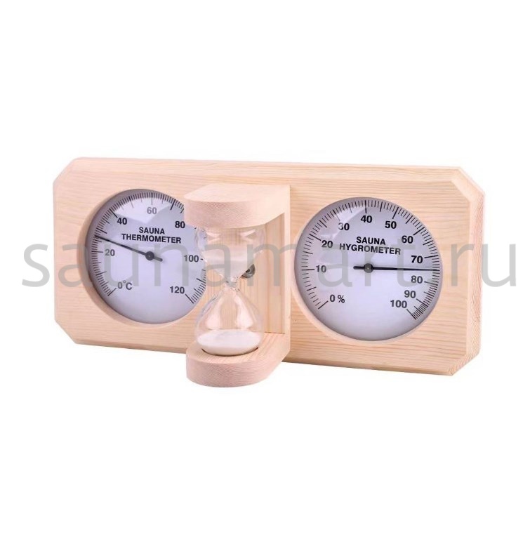 Термогигрометр со встроенными песочными часами 3 в 1 это товары для бани и сауны, - универсальные аксессуары для обустройства бани, которые создают уют, комфорт, удобство и особенную атмосферу в парилке русской бани. В широкой раме из дерева находятся два круглых циферблата под термостойким стеклом: термометр и гигрометр. Градуировка шкалы гигрометра варьируется в пределах от 0 до 100 %. Градуировка шкалы термометра варьируется в пределах от 0 до 120 градусов по Цельсию. Предусмотрена возможность калибровки измерительного прибора. Между циферблатами располагаются песочные часы для бани, рассчитанные на 15 минут. Это идеальное время нахождения в парилке. Банный аксессуар не боится высокой влажности и температуры, поэтому идеально подходит для использования в любом парильном помещении, как в условиях русской бани, финской сауны так и хамама. Предназначен для настенного размещения. Помните, чтобы проведённое в парной время оказало благоприятный эффект на здоровье и самочувствие, необходимо тщательно соблюдать температурный режим парения, режим влажности и длительности пребывания в парной. Не подвергайте прибор ударам и падению. Упаковано в картонную коробку. Все банные принадлежности нужно выбирать тщательным образом. Представленный банный аксессуар изготовлен из экологичного сырья и прошел все этапы сушки и обработки. Банная метеостанция станет прекрасным подарком для банщиков, отца, мамы, дедушки, мужа, сына, внука, друга, брата, которые любят русскую баню. Эта стильное интерьерное решение подойдет еще и для ванной комнаты и балкона.