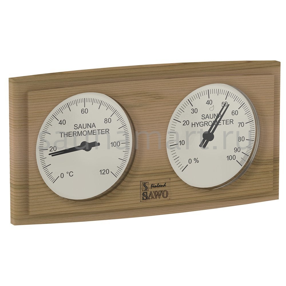 SAWO Термогигрометр 271-THD Закругленный термогигрометр Sawo отличается надёжностью и долговечностью. Он позволяет одновременно контролировать влажность и температуру в сауне. Корпус прибора выполнен из пиломатериалов лиственных пород. Термогигрометр впишется в интерьер любой сауны, украсив его. Температурная шкала термометра от 20 до 120 градусов. Размеры: 225х125 мм Материал: пиломатериалы лиственных пород Производитель: Финляндия