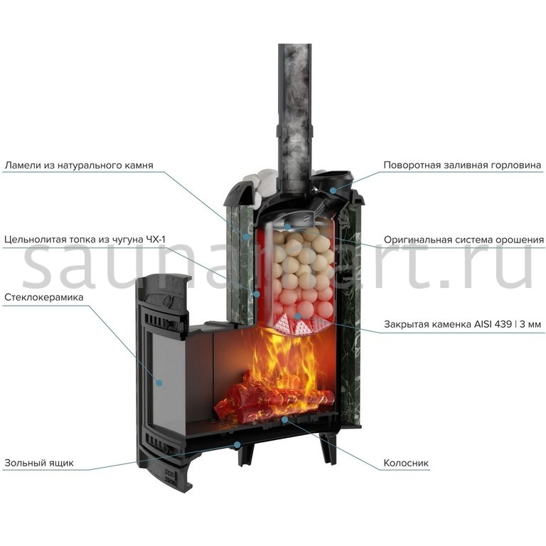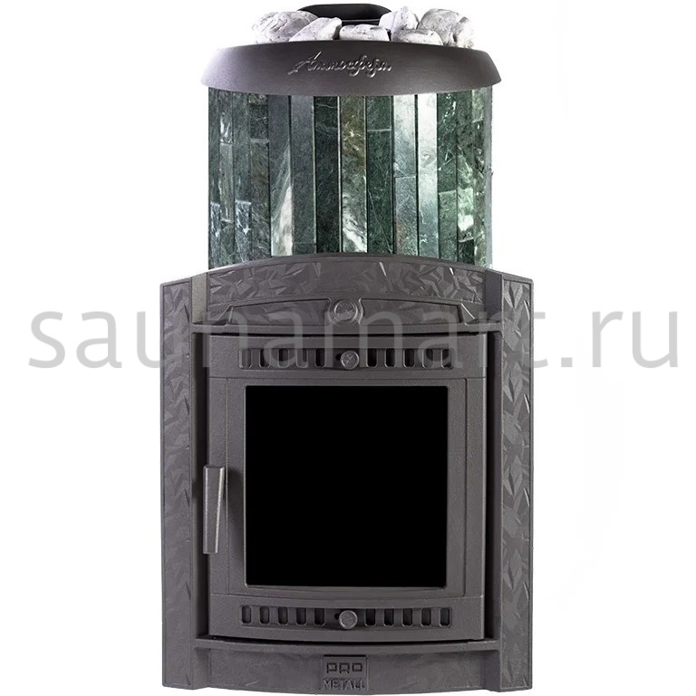 Модель с увеличенной каменкой и повышенной производительностью. Ламели из змеевика по периметру внешней каменки не только обладают хорошими теплонакопительными свойствами, но и придают печи оригинальный внешний вид.