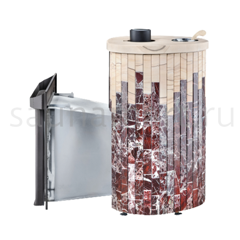Благодаря облицовке из натурального камня по технологии "Ламель" несёт удивительное, целебное тепло, сохраняя, навсегда, изумительный облик. Печь для бани от завода V?HRINGER, в облицовке "Ламель", может быть изготовлена из камня Жадеит или "Окаменевшее дерево", когда великолепный, сугубо индивидуальный орнамент каменного среза, переносится на печь.