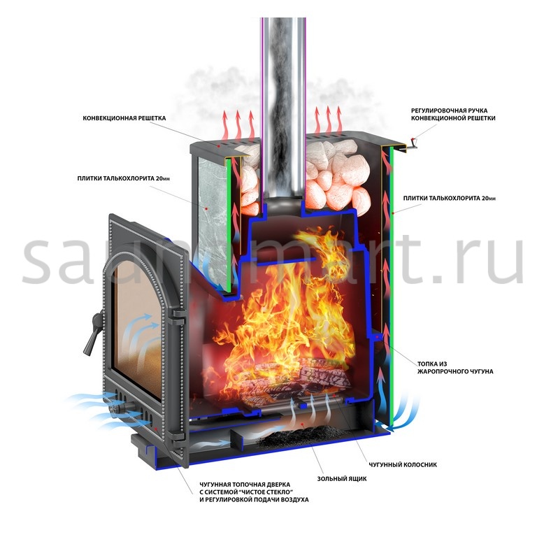 Преимущество печи в том, что топка печи состоит из 3-х ЧУГУННЫХ элементов. На стыке между ними используется керамический шнур с рабочей температурой 1200 градусов. То есть топка печи абсолютно герметична! Для фиксации деталей между собой применяется болтовое соединение, что даёт 100% гарантию безопасности при эксплуатации. Конвекционно–вентилируемая облицовка, изготовленная из экологически чистой горной породы, обладает большой теплоёмкостью, что позволяет камню в короткие сроки нагреваться и максимально долго удерживать стабильную температуру в парильном помещении, а также гасить жёсткое инфракрасное излучение. Камень обладает исключительными лечебными свойствами: помогает при головных болях, при нестабильном артериальном давлении, при простудных заболеваниях, воспалительных процессах в почках и пищеварительной системе, снимает повышенную возбудимость и нервозность, сглаживает эмоциональные всплески. Облицовка из натурального камня при нагреве способна аккумулировать тепло, что гарантирует максимально равномерный прогрев и сохранение тепла. Банная печь ЛЕГЕНДА 16 (224) укомплектована чугунной каминной, самоохлаждаемой дверцей Везувий 224 с большим жаропрочным стеклом «SCHOTT ROBAX», с оборудованной системой самоочистки, что позволяет визуально контролировать горение и любоваться видом живого огня. Данная печь рассчитана на объем парильного помещения 8-18 м3.