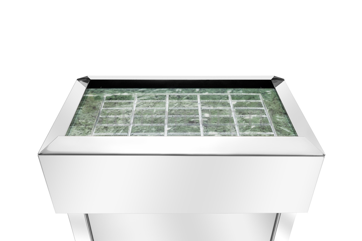 Каменка идет в комплекте с горизонтальной нагревательной плитой из природного камня Змеевика высотой 6 см и массой 15 кг. На плите имеются распилы специальной формы, которые позволяют применять её в качестве испарителя. Змеевик уже долгие годы используется для изготовления печей для бань. Он хорошо нагревается, долго держит тепло и выдерживает резкие перепады температур не растрескиваясь.