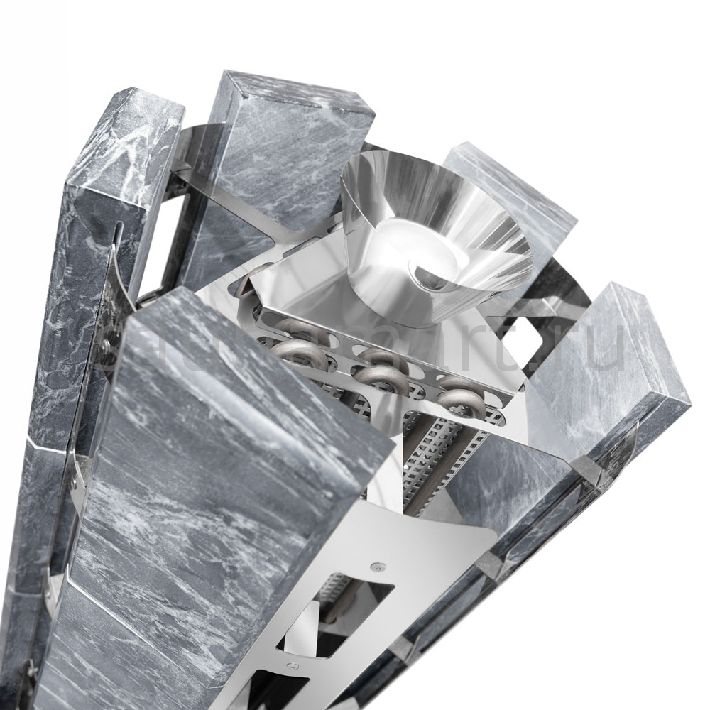 Все корпусные элементы печи выполнены из нержавеющей стали. Нагревательный элемент - ТЭН диаметром 10мм. Наружный кожух каменки дополнительно облицован плитами из Талькохлорита толщиной 40мм, что придает ей еще большую теплоемкость и меньшее излучение от металлических элементов, которые выжигают воздух в парной. Общий вес камней – 205кг (120кг – загрузка камней в печь и 85кг - вес облицовки), что сопоставимо с закладкой камней в хорошую дровяную печь. Тем самым с помощью парогенератора, закрытой каменки и закладки камня в 205 кг, легко достигается режим настоящей русской бани.