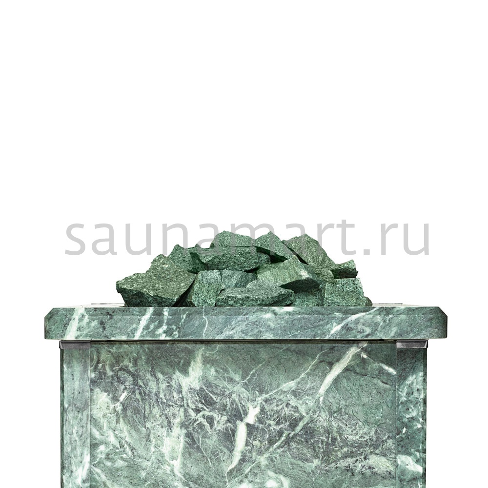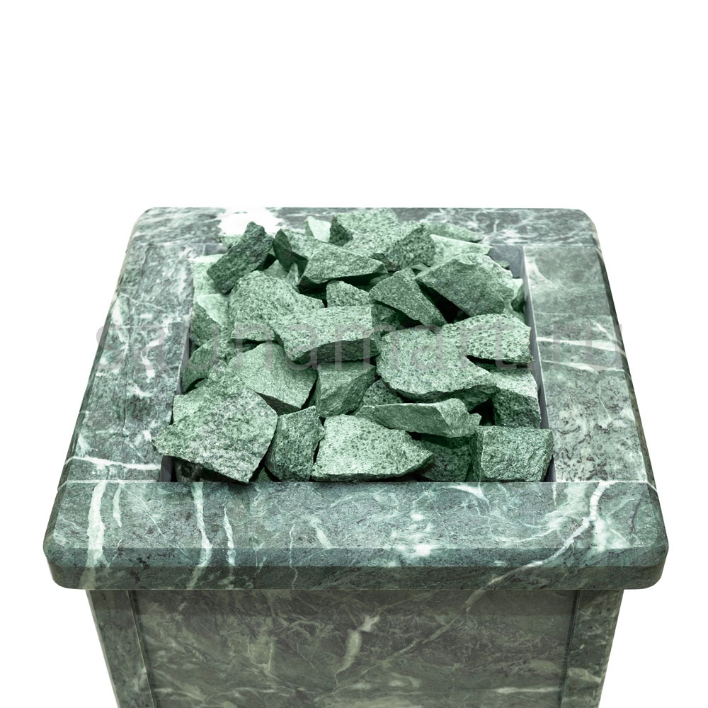 Электрическая каменка со всех сторон облицована натуральным змеевиком. Печь с подобным дизайном стильно смотрится в парильном помещении. Змеевик уже долгие годы используется для внутренней отделки бань. Его называют «аптекарским камнем» за его целебные качества. Минерал оказывает обеззараживающий эффект, положительно влияет на кости, оказывает успокаивающее воздействие и укрепляет иммунитет.