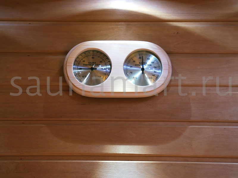 Термометр-гигрометр Sawo для саун сочетает в себе две полезные функции – измерение температуры и влажности воздуха. Вас непременно порадует качество и внешний вид прибора. Лучшим местом для установки прибора является наиболее удалённая стена относительно входа и печи. Укреплять его следует на высоте 1,5м от пола.
